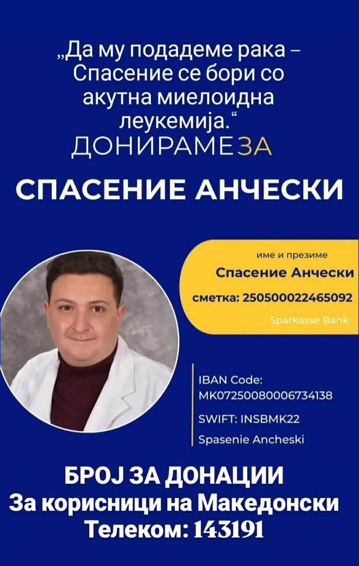 Нашиот студент по медицина Спасение Анчески од Скопје, се соочува со сериозна здравствена состојба: акутна миелоидна леукемија (АМЛ). Првата хемотерапија која ја прими во Македонија, за жал, не даде посакувани резултати.