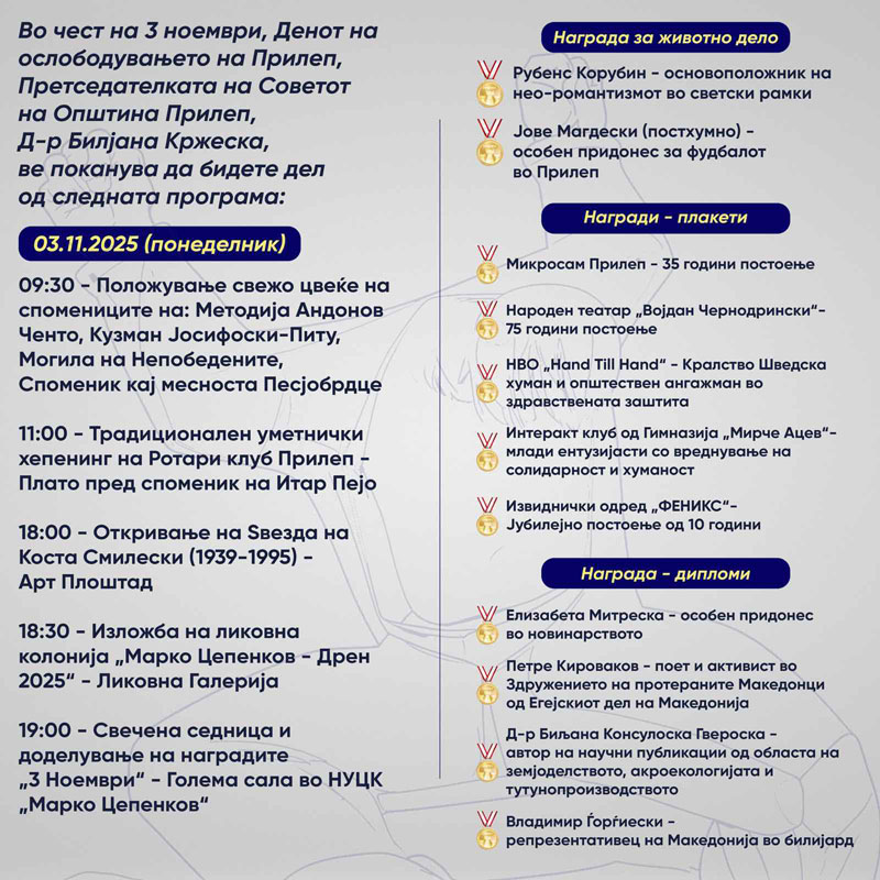Општина Прилеп и Советот на Општина Прилеп ги покануваат граѓаните да се приклучат на одбележувањето на 3 ноември, денот кога Прилеп ја прославува својата слобода.