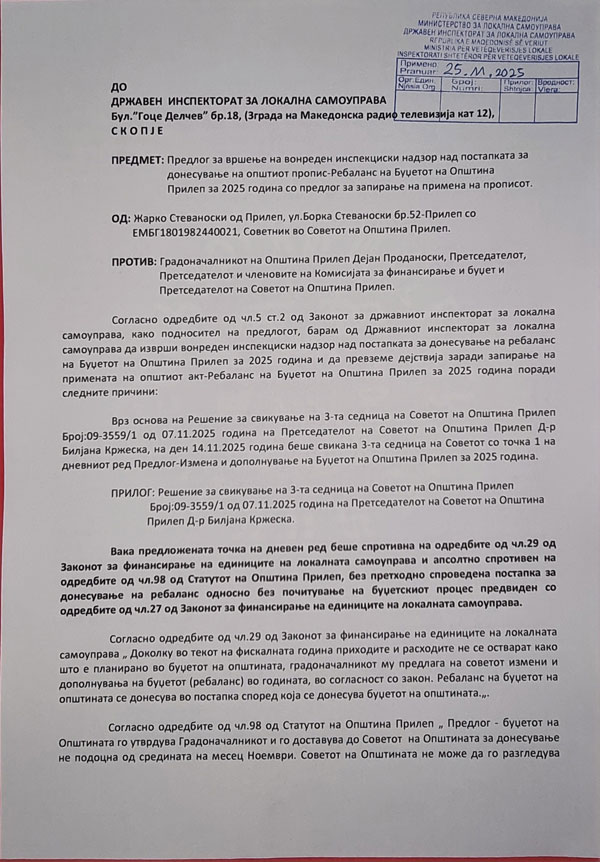 На последните седници на Советот на Општина Прилеп, на кои од страна на градоначалникот Дејан Проданоски, беа предложени две клучни точки – Ребаланс на буџетот и Измени и дополнувања на развојните програми за периодот 2025-2027, мнозинството предводено од ВМРО-ДПМНЕ, како што информира советникот од Левица, Жарко Стеваноски, го изгласало ребалансот спротивно на законот за финансирање на единиците за локална самоуправа.