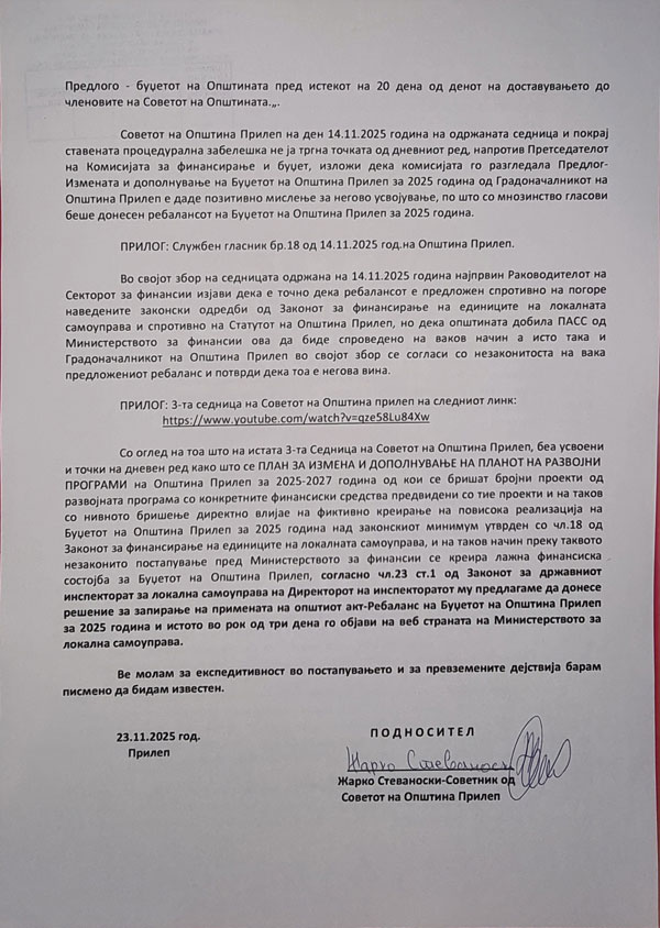„Од Развојните програми ги избриша сите проекти кои повлекуваа најголем процент од Буџетот на општината за 2025 година и на таков начин фиктивно го зголеми процентот на реализација на Буџетот за 2025 година. Практично Советот му помогна на Градоначалникот да фалсификува финансиски извештај за Општина Прилеп за 2025 година пред Министерството за финансии“, вели Стевановски и додаде дека Левица веќе има подготвено иницијатива за вонреден инспекциски надзор до Државниот инспекторатот за локална самоуправа.