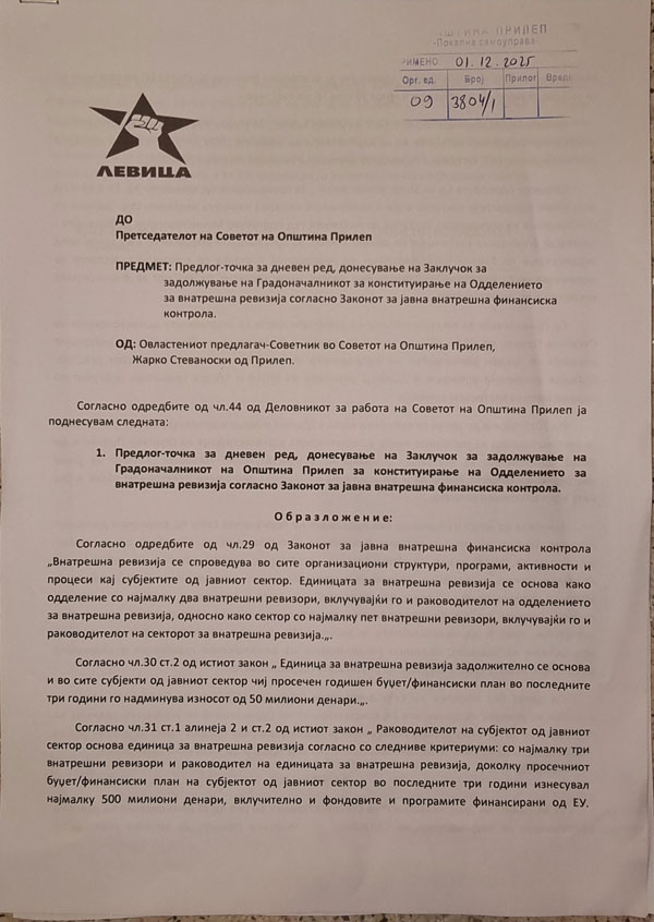 Дополнително, како што информира Стеваноски, ВМРО – ДПМНЕ одбиле да расправаат по предлогот на Левица со кој градоначалникот би бил задолжен да го конституира Одделението за внатрешна ревизија што е законска обврска која Општина Прилеп ја игнорира уште од 2015 година. Внатрешната ревизија е клучен механизам за контрола и спречување злоупотреби на јавните средства, уреден со Законот за јавна внатрешна финансиска контрола.