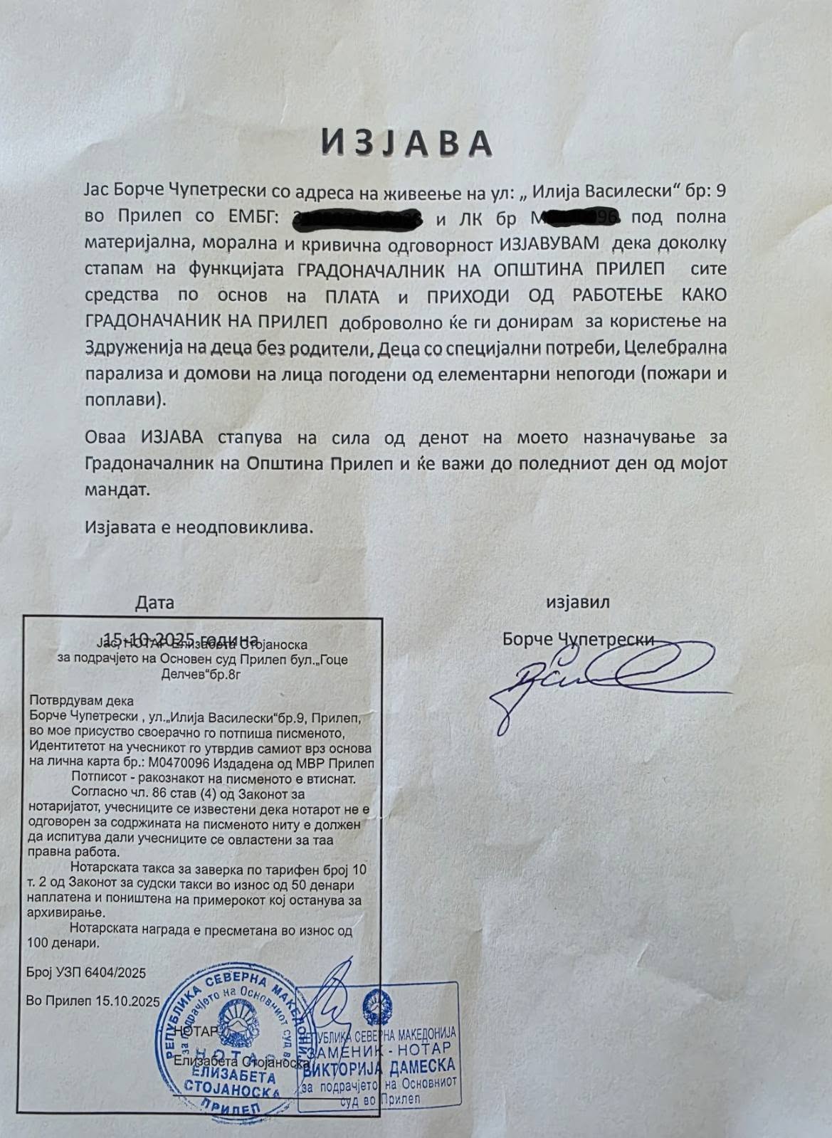 Читам обвинувате и мислите дека е „се за пари?“ Не е. Грешка сте. Мене со пари не ме купувате. Во животот сум имал и премногу и премалку. Но, секогаш сум имал достоинство и чест. Јас, Борче Чупетрески, како човек од чест и морал и човек кој ги практикува овие вредности, Ви ја доставувам мојата писмена изјава со која ИЗЈАВУВАМ дека нема да работам за народни пари, вели Борче Чупетрески, независен кандидат за градоначалник за Прилеп.